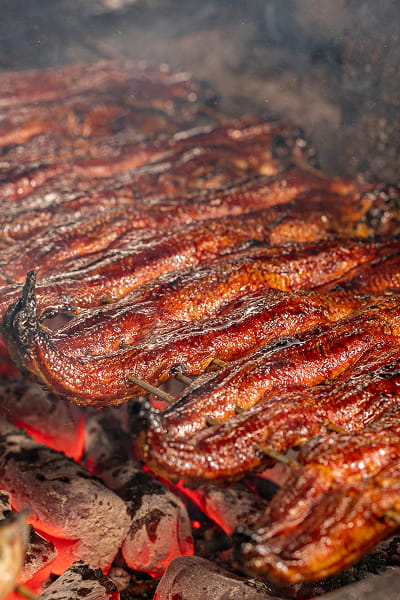 調理法は、関西風の地焼き。活うなぎを一尾ずつ腹開きし、金串を打ち、蒸さずに高火力の備長炭で焼き上げます。外はパリッと香ばしく、中はふっくらと綺麗に仕上げるのが職人の腕の見せ所です。